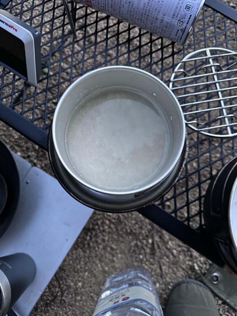 2. 小クッカーにお米と水を入れ、30分浸水させる。